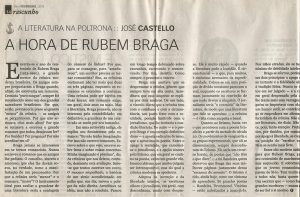 José Castello, grande crítico literário, escreveu sobre Rubem Braga depois do centenário. O texto foi publicado no jornal Rascunho, em fevereiro de 2014. Trata principalmente da relação de Rubem Braga com a crônica, lembrando logo no começo que amigos do escritor tentavam lhe convencer a produzir um romance. Não aconteceu. Castello fala de Braga para tratar da relevância da Literatura, não importa o gênero. E que nisso é preciso até discordar do cronista, que frequentemente afirmava fazer algo sem tanta importância: “Não chega a ser Literatura”, dizia. O tempo mostra mais e mais que não, que a obra de Rubem Braga é gigante em influência, prazer e relevância. “Esses são motivos suficientes para que Rubem Braga, passado seu centenário de nascimento, não seja esquecido. E sobretudo para que os jovens romancistas não parem de lê-lo. Tem muito a dizer a todos nós, basta querer ouvir. Um escritor que – como fazem os grandes escritores – nunca deixou de ser fiel a si mesmo”, arrematou Castello.