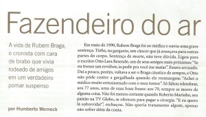 O quarto tesouro foi escrito por Humberto Werneck e publicado pela revista Vida Simples. A reportagem é Fazendeiro do ar – A vida de Rubem Braga, o cronista que vivia rodeado de amigos em um verdadeiro pomas suspenso. Werneck, como é uma de suas especialidades, nos aproxima do escritor, põe o leitor ao lado de Rubem Braga, pela trajetória riquíssima que teve, em vivências, desde o primeiro trabalho como jornalista, passando pela cobertura da Segunda Guerra, e pela inevitável cobertura de Ipanema, no Rio de Janeiro, onde fez crescer uma verdadeira floresta em redor de seu apartamento. Entre outras passagens muito gostosas, Werneck escreveu: “Na sua limpidez, o texto do cronista maior pode dar aos desavisados a ilusão de serem também eles capazes de escrever algo assim. Trata-se daquilo que o poeta Hélio Pellegrino chamou de ‘a difícil arte de escrever fácil’. Tecidas sem pompa ou grandiloquência, as crônicas de Rubem Braga são feitas de palavras simples – não por acaso, ele achava que um dos versos mais belos da língua portuguesa é este decassílabo, sem qualquer enfeite, de Luís de Camões: ‘A grande dor das coisas que passaram’.”