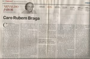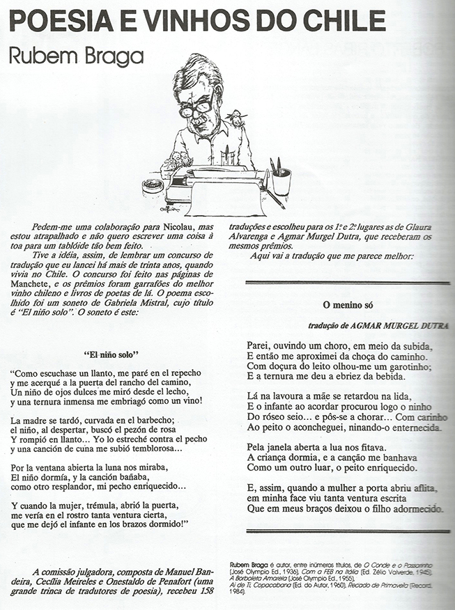Na terceira edição apenas de Nicolau, impresso que abrilhantou os anos 1980 e 1990 a partir do Paraná, tem uma coluna assinada pelo próprio Braga. Generoso, em vez de escrever muito, abriu espaço para outros autores e para a poesia, sua paixão como leitor. Ele sacou, de um concurso que havia promovido na antiga revista Manchete, a tradução de um poema de Gabriela Mistral (chilena, prêmio Nobel de Literatura). O vencedor do concurso foi Agmar Murgel Dutra, que, diz o cronista, ganhou garrafões de vinho chileno e livros de poetas do Chile. Essa ligação forte com o gênero está no livro A Poesia é necessária (Global Editora), um recorte do que Braga mais gostava e oferecia aos leitores, trabalho ao mesmo tempo de louvor e educação que ele fez em veículos de grande circulação e influência.
